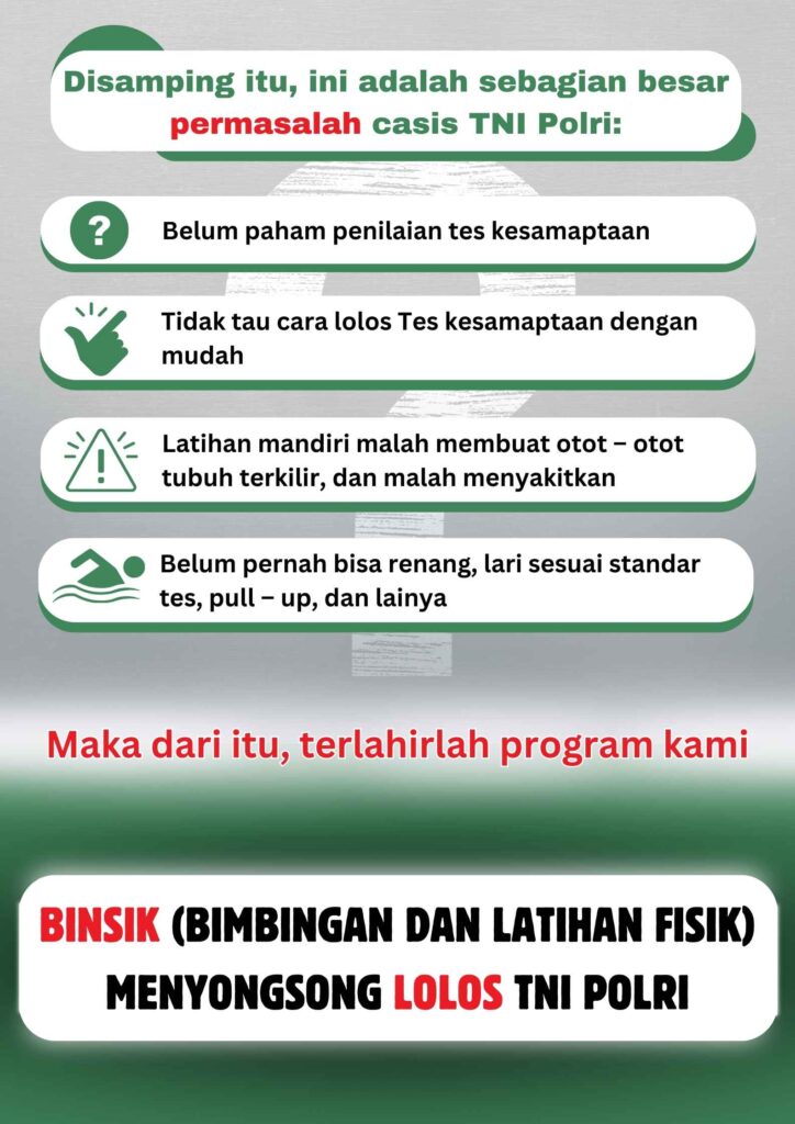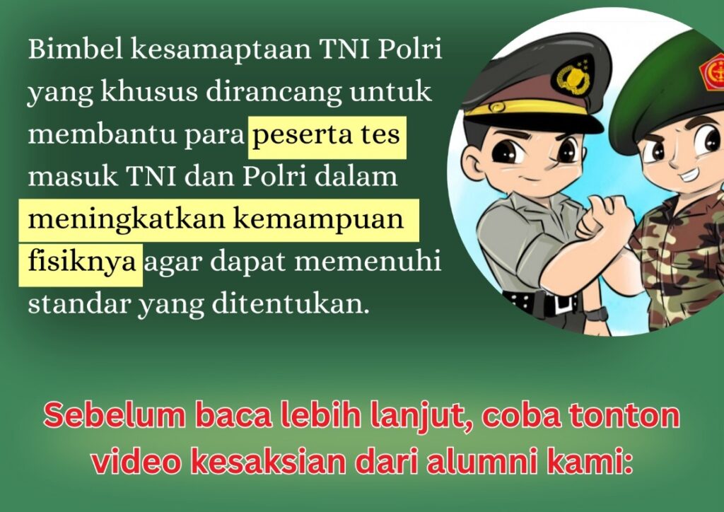 Bimbel kesamaptaan TNI/Polri adalah program bimbingan belajar yang dirancang khusus untuk membantu calon peserta didik mempersiapkan diri dalam tes kesamaptaan fisik yang menjadi salah satu syarat masuk di TNI/Polri.