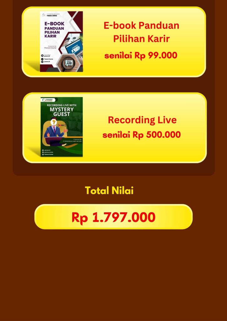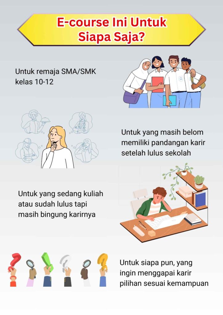 E-course ini memberikan panduan lengkap dan tersusun rapi untuk mengatasi segala hal yang berkaitan dengan masalah anda dalam hal menentukan pilihan karir.