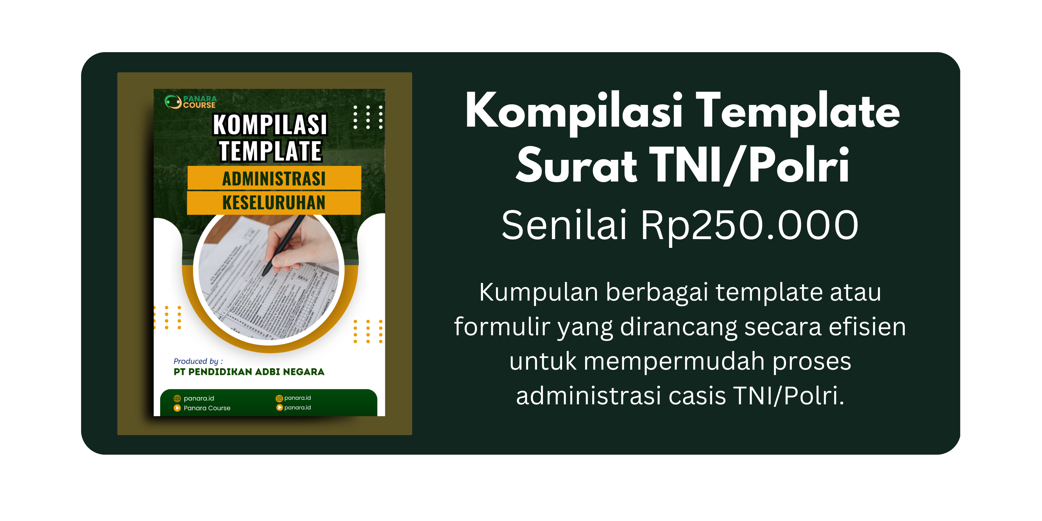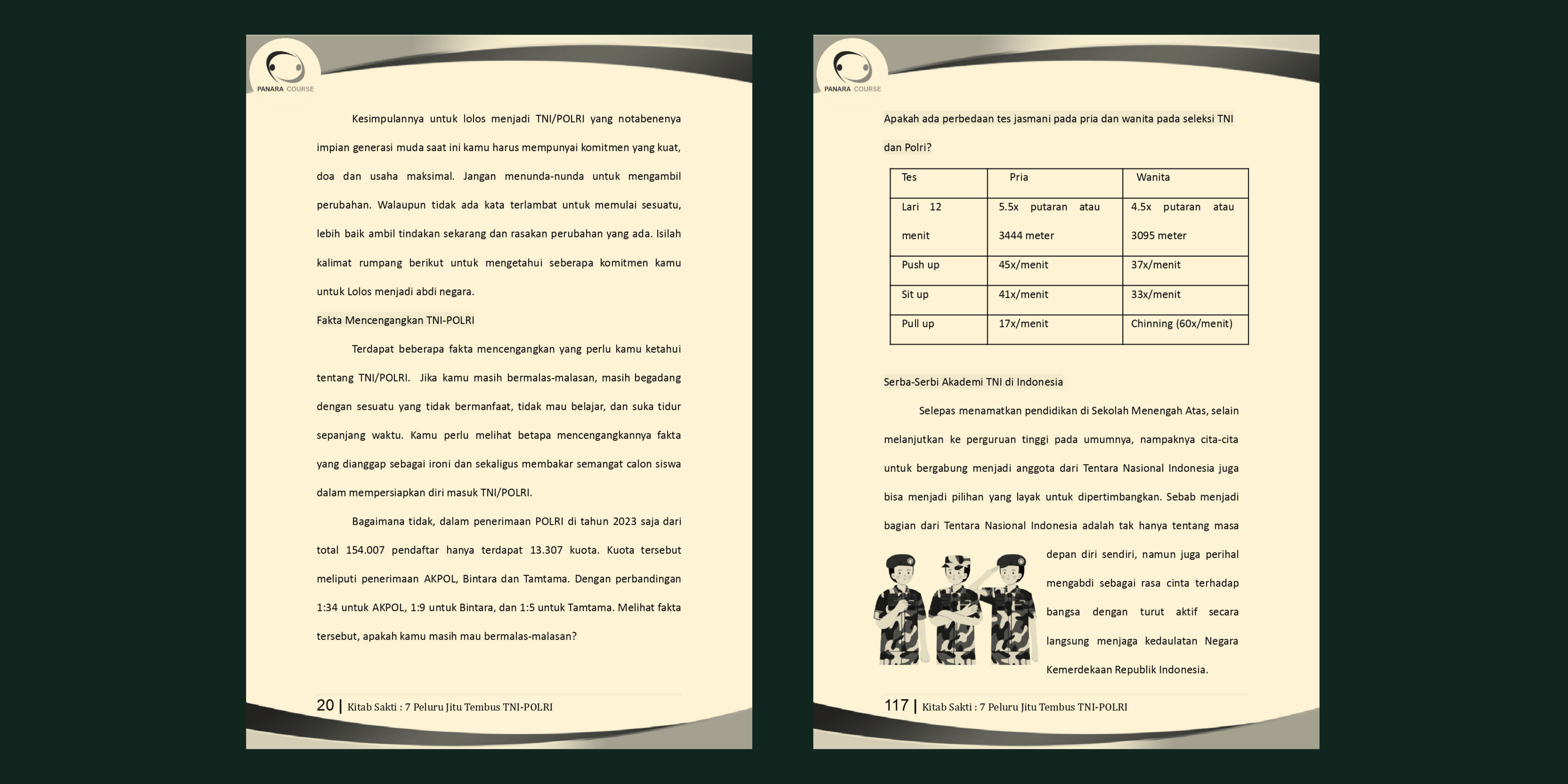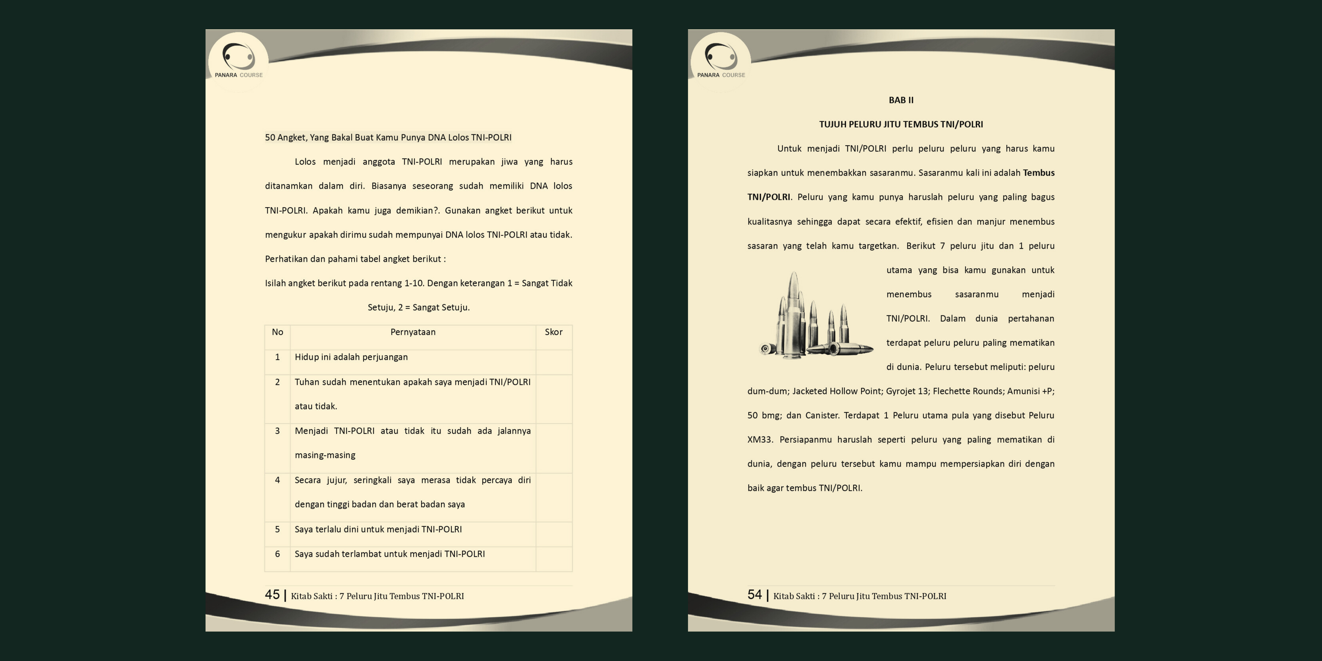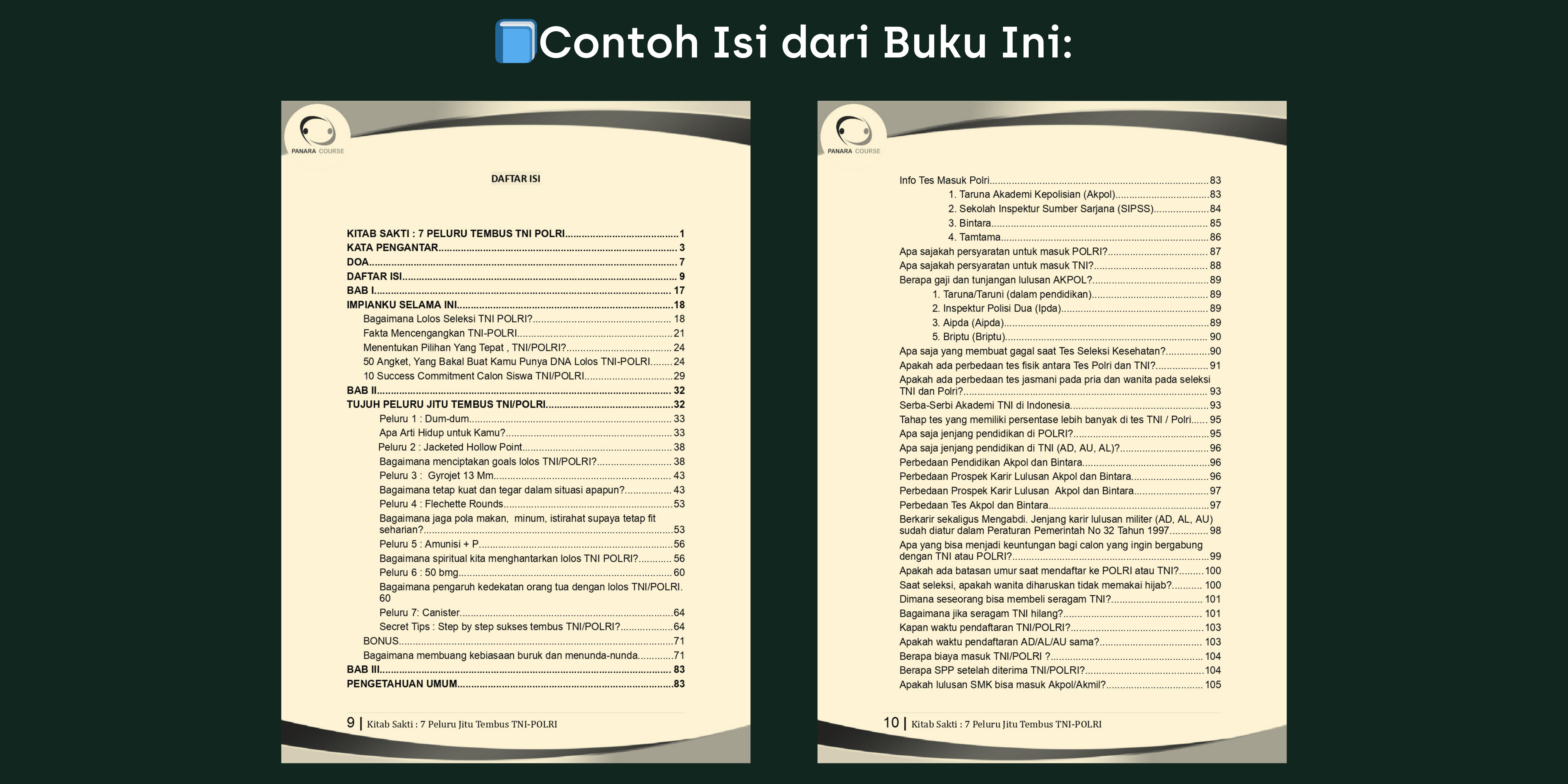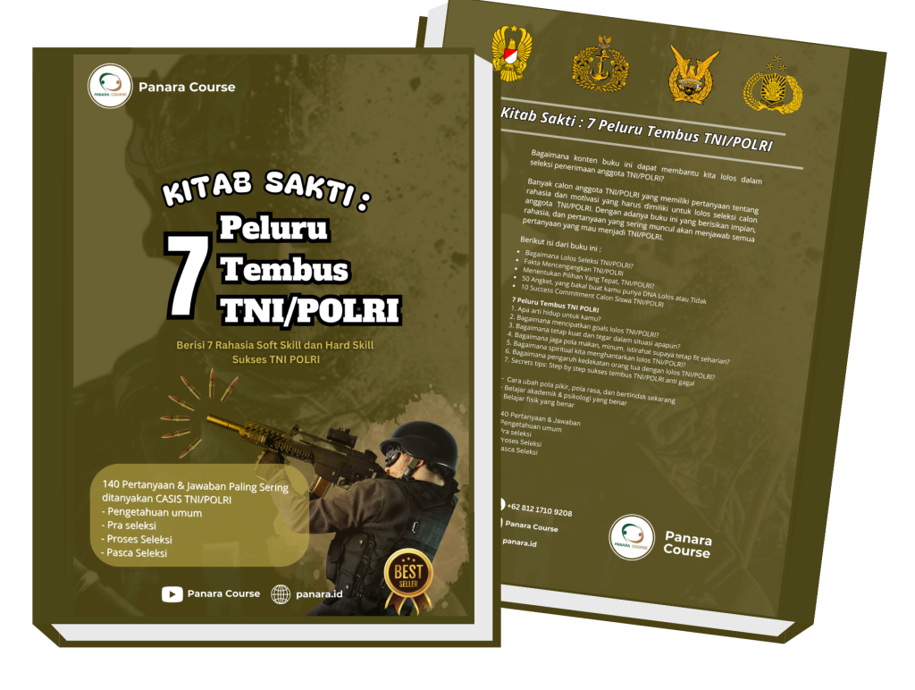 Selamat datang di Panara Course 😊, bimbel TNI/Polri terdepan! Dapatkan panduan eksklusif dengan “Kitab Sakti: 7 Peluru Tembus TNI/Polri”. Bagi Anda yang yang ingin persiapan seleksi meningkat pesat, Anda bisa meningkatkannya dengan buku sakti ini.