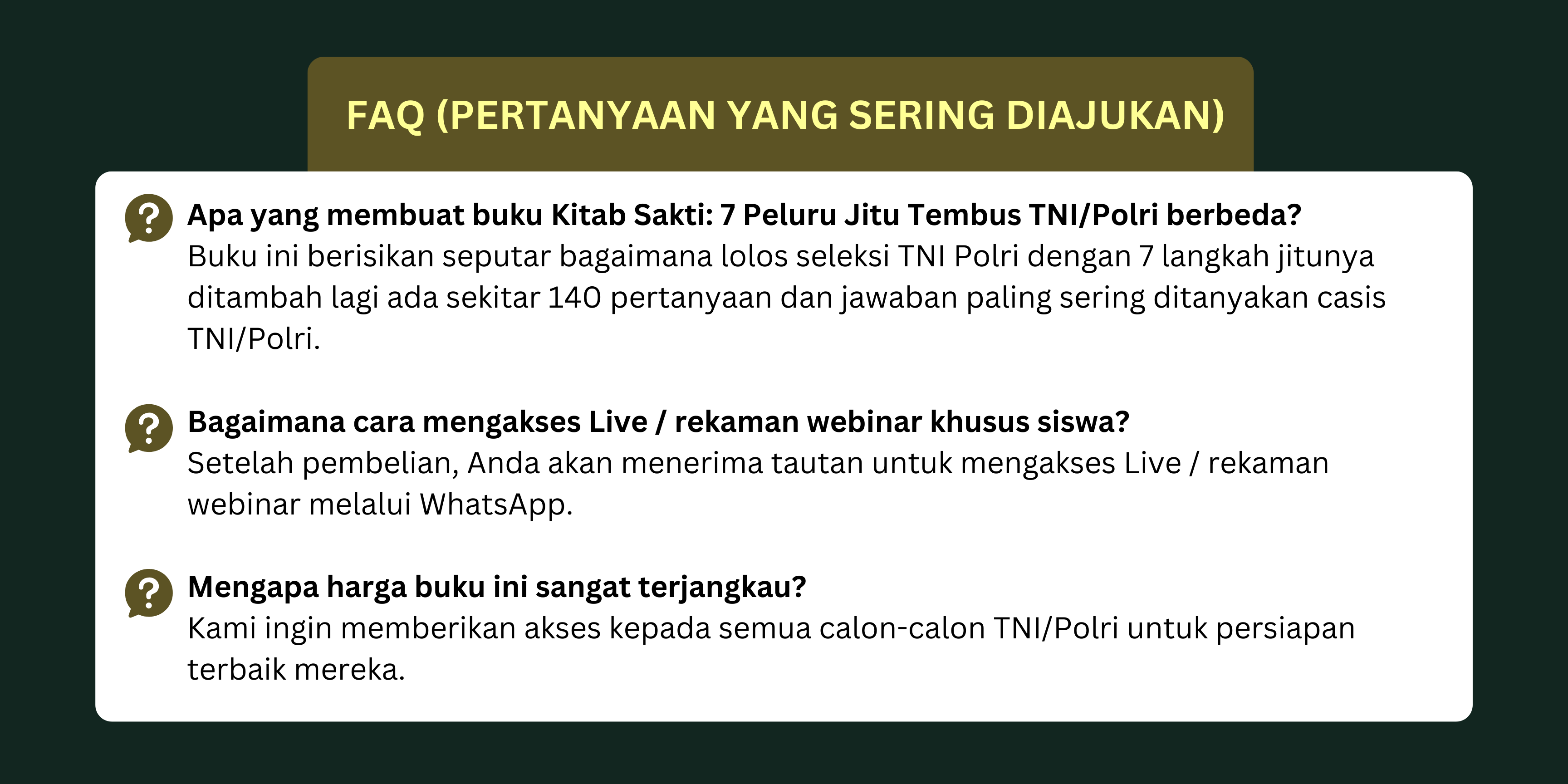 Nah, kami hadir mengatasi berbagai permasalahan yang Anda hadapi dengan produk premium kami. Sebuah buku yang berjudul “KITAB SAKTI: 7 PELURU TEMBUS TNI/POLRI”