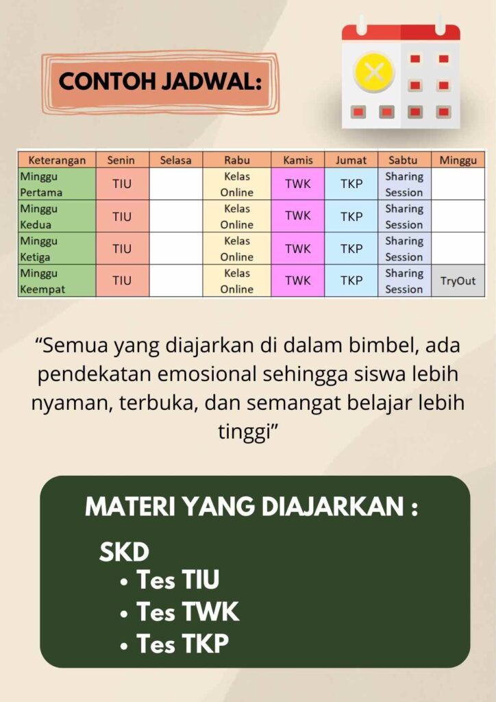Panara Course akan membantu seoptimal mungkin untuk seluruh peserta bimbingan belajar, dimana seluruh kurikulum belajar akan disesuaikan dengan tipe – tipe soal yang memang sering diteskan untuk seleksi CPNS
