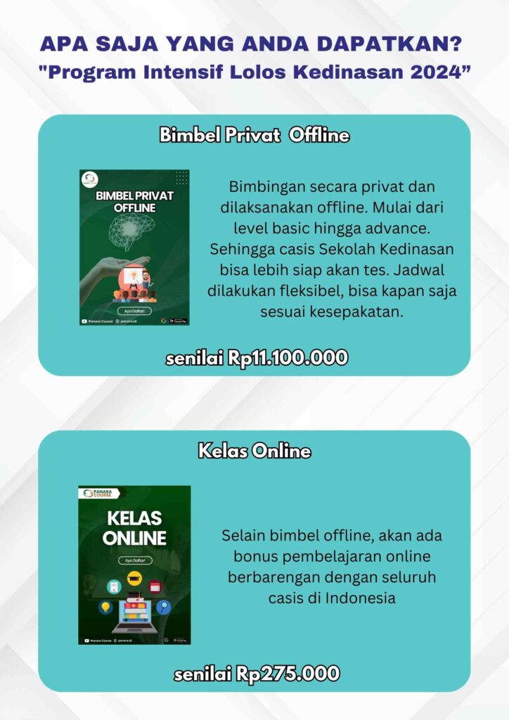 Program ini dirancang khusus untuk persiapan seleksi Kedinasan tahun 2024 secara menyeluruh dan mendalam, memberikan pendekatan intensif dan terstruktur.