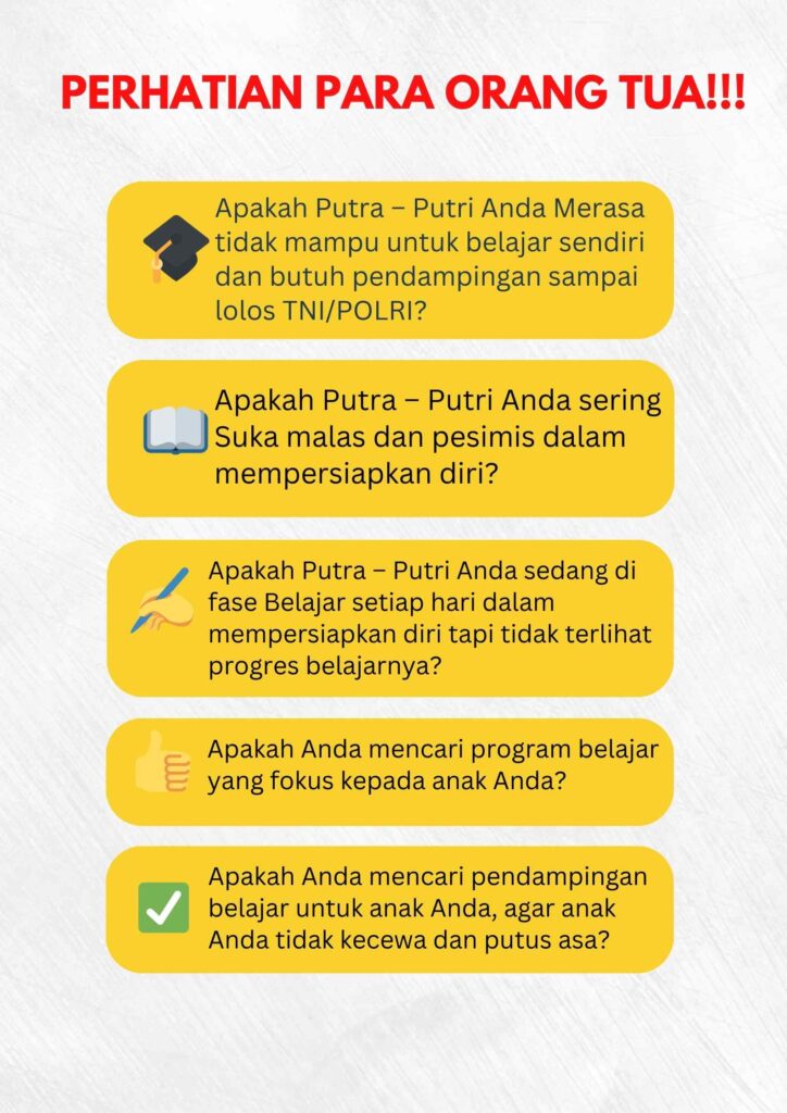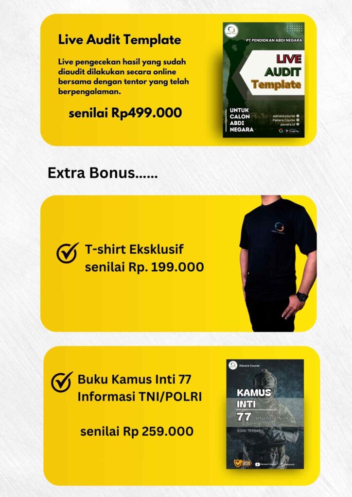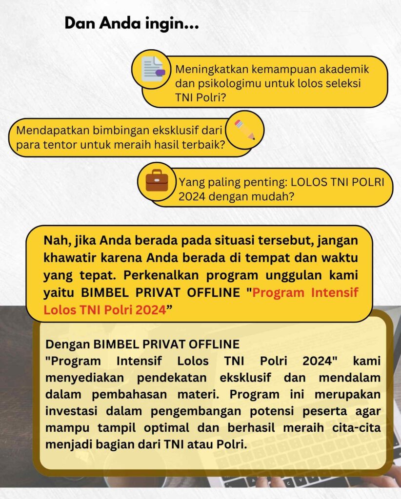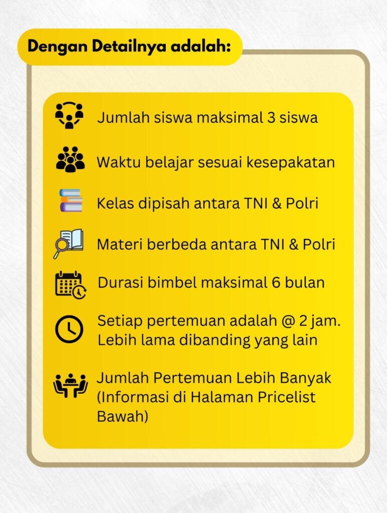 Program ini dirancang khusus untuk persiapan seleksi TNI dan Polri tahun 2024 secara menyeluruh dan mendalam, memberikan pendekatan intensif dan terstruktur.