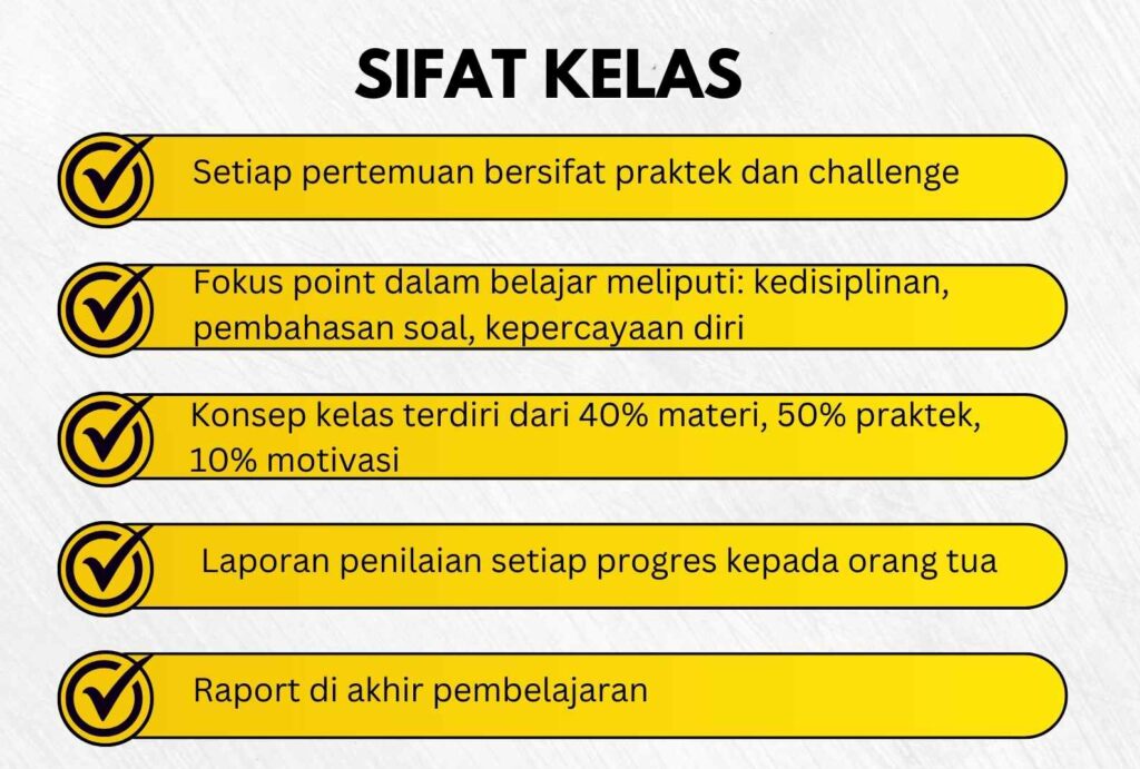 Untuk 1 materi 10x pertemuan. Anda bisa mendapatkan 2 materi dengan 20x pertemuan dengan durasi les 3 bulan intensif.