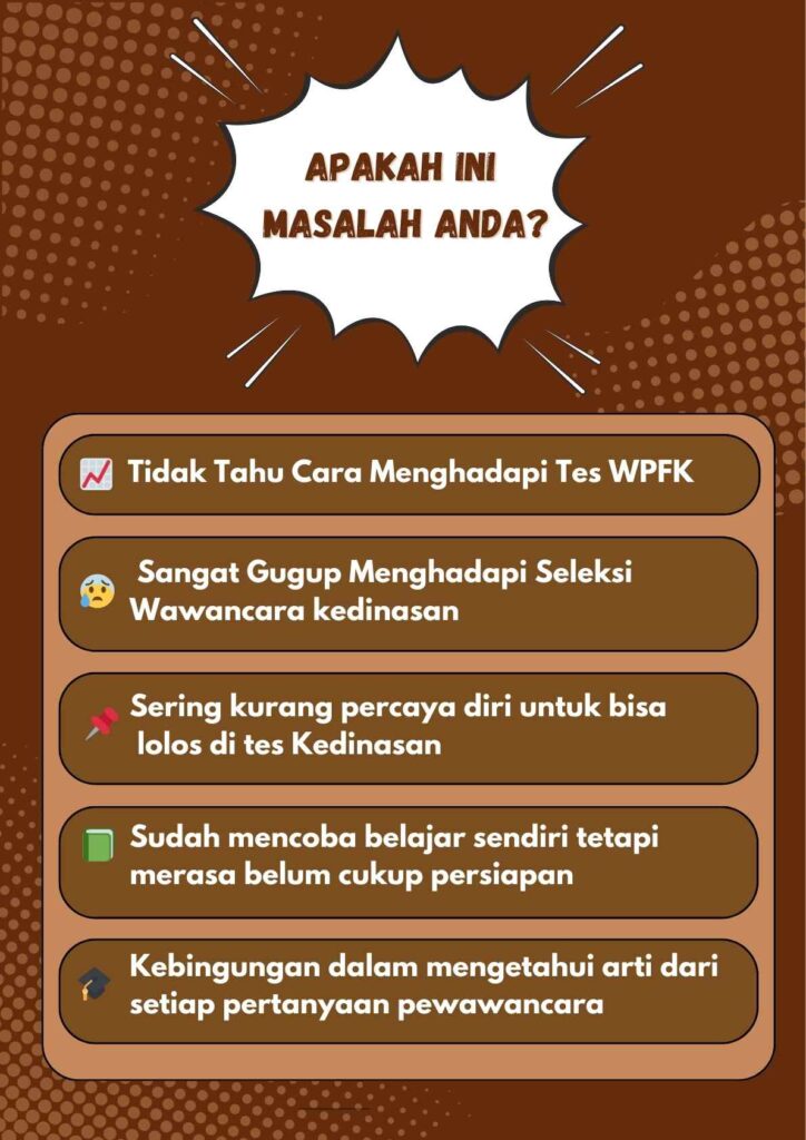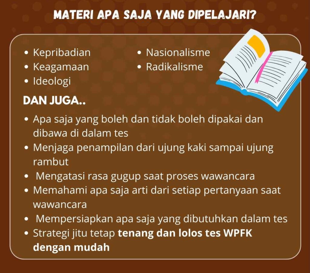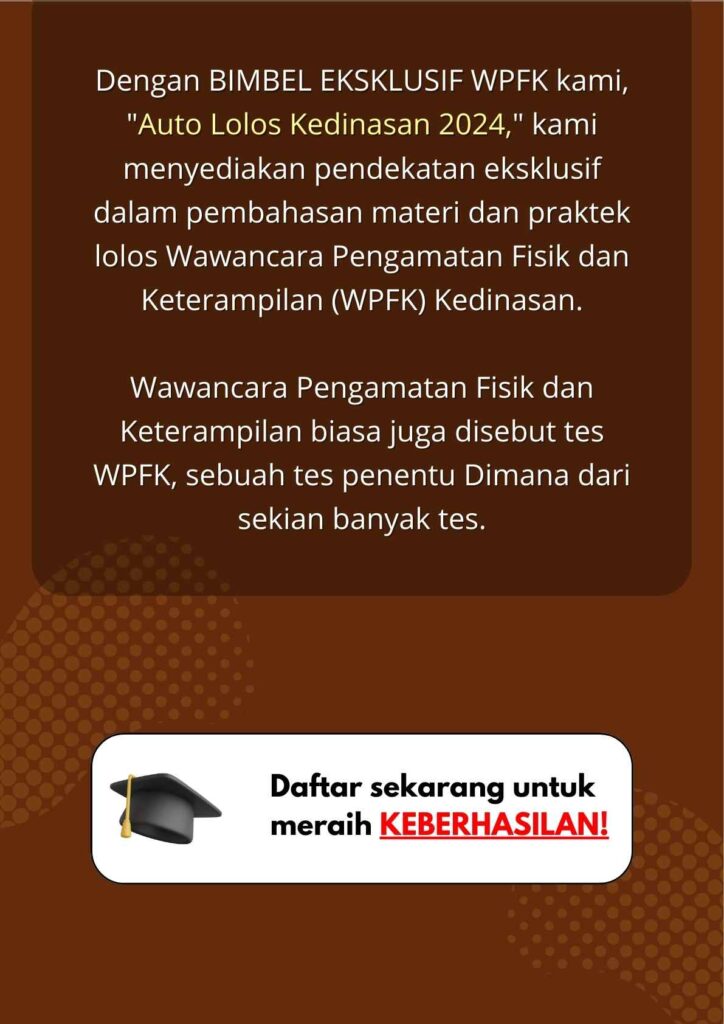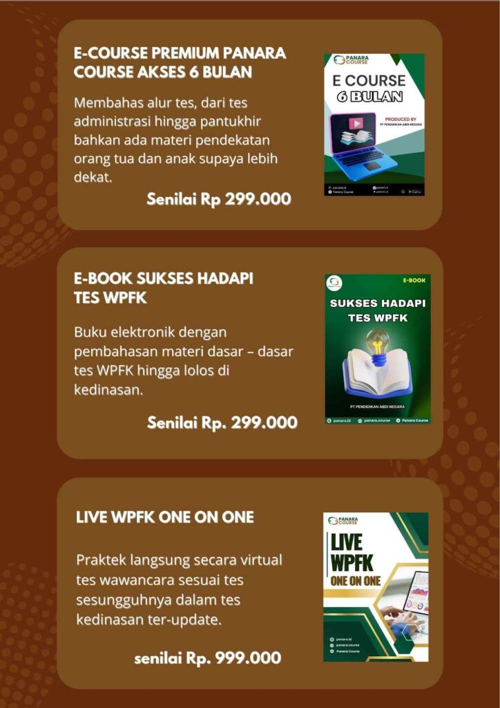 Bimbel WPFK adalah program pelatihan yang bertujuan untuk mempersiapkan peserta menghadapi tes wawancara Kedinasan dengan baik dan menguji pemahaman mereka terhadap kepercayaan seseorang